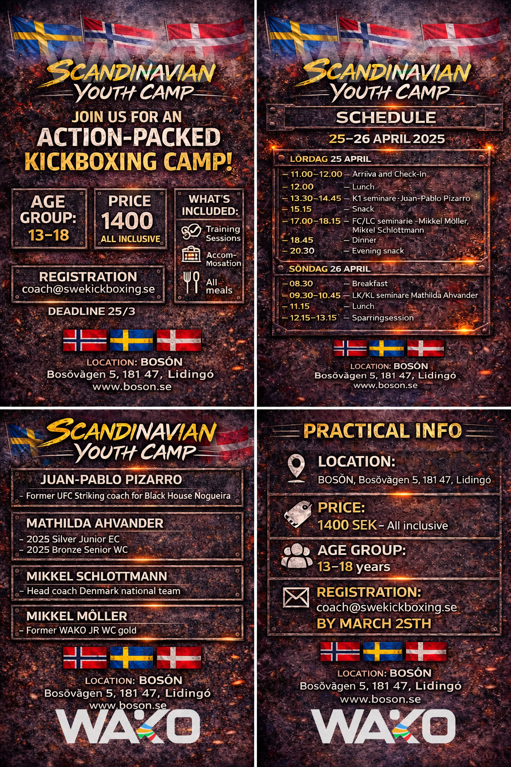 Swedish kickboxing federation invites you all to the 4th WAKO Scandinavian Youth Camp, a cooperation between the Norweigan, Danish and Swedish federations.