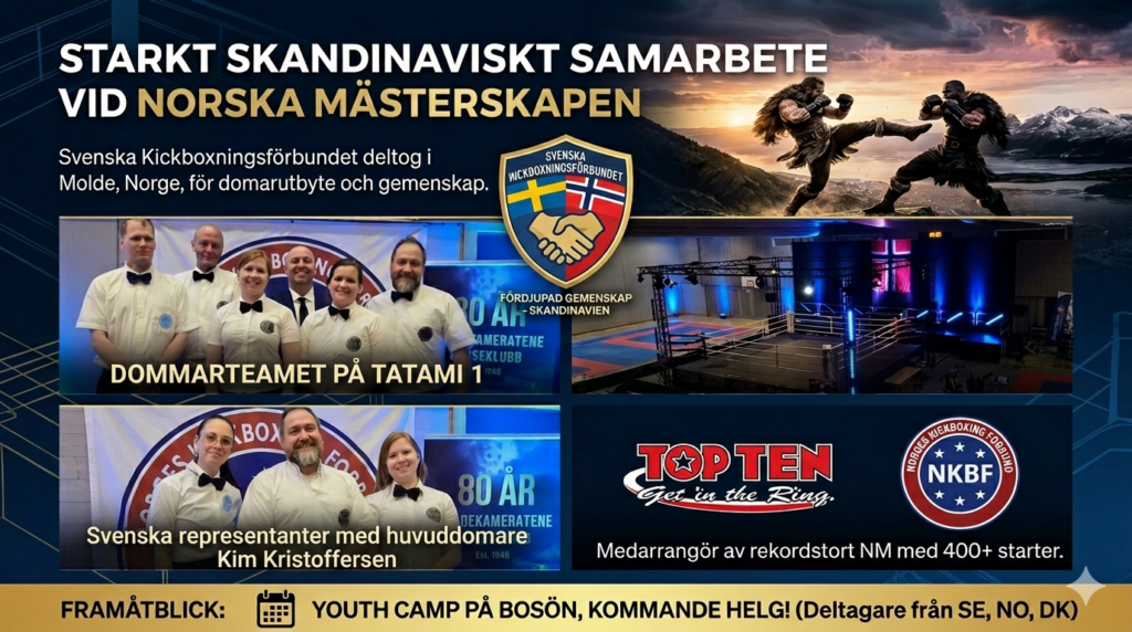 Blicken framåt: Youth Camp på Bosön Det skandinaviska samarbetet fortsätter redan kommande helg. Då arrangerar Svenska Kickboxningsförbundet Youth Camp på Bosön, där ungdomar från Sverige, Norge och Danmark deltar. Genom att dela kunskap och resurser över gränserna bygger vi en starkare framtid för sporten i hela Norden.